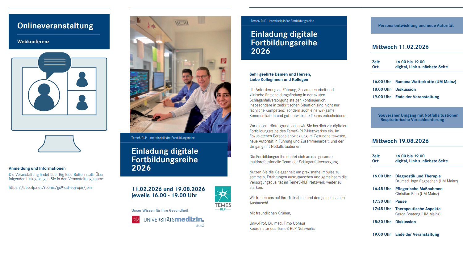 Die Fortbildungsreihe richtet sich an das gesamte multiprofessionelle Team der Schlaganfallversorgung. Nutzen Sie die Gelegenheit um praxisnahe Impulse zu sammeln, Erfahrungen auszutauschen und gemeinsam die Versorgungsqualität im TemeS-RLP Netzwerk weiter zu stärken.